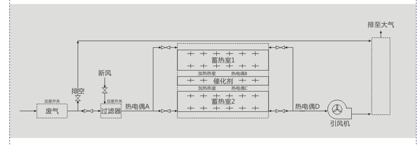 废气净化系统主要由除尘预处理、吸附床、热交换器、加热室、催化床、引风机、电控柜及安全报警装置等组成。