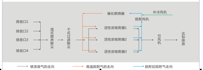 ②喷漆废气的净化工艺是先经过湿式喷淋除尘和干式脱水除尘后,再经过活性炭吸附后实现达标排放;